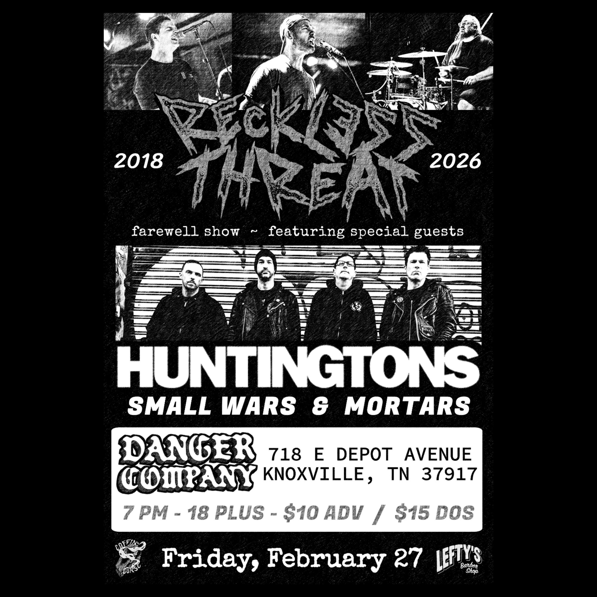 Come celebrate the final Reckless Threat show at Danger Company in Knoxville on Friday, February 27th. Joining Reckless Threat are Knoxville favorites Mortars and Small Wars, with the Huntingtons from Baltimore, Maryland.