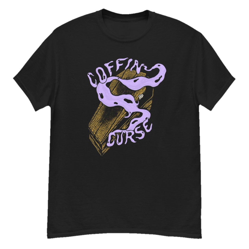 Coffin Curse Records three color print on black fabric. Custom design by Jim Erickson aka THAT SCUMBAG JIM - instagram.com/thatscumbagjim